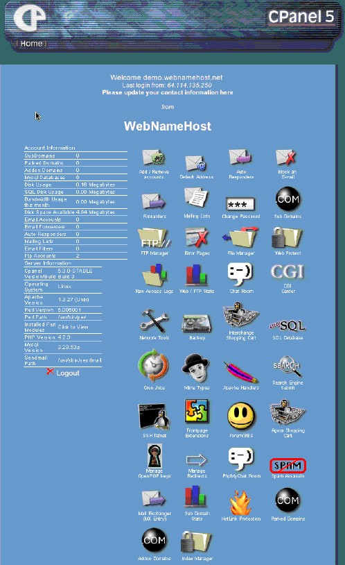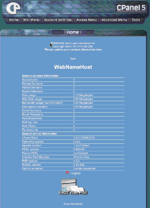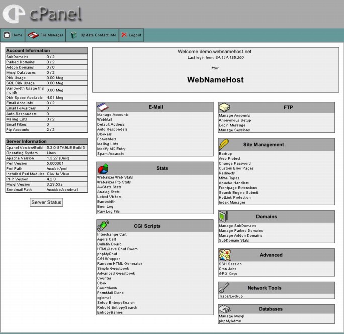 The first screen shots below and the demonstration are of the cPanel xSkin2 (now the default for all anew accounts) and BlueLagoon cPanel skin, offered standard on all WebNameHost accounts at no additional cost. The version numbers and options were as of the creation of this screen shot. Other cPanel themes shown below are also available. If you want one of them, say so at the time of ordering. Sorry, we no longer have a demo account because of security considerations. Too many people do nasty things with demo accounts.
